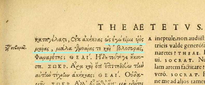 Note : pour illustrer cet article, j’ai encore choisi un détail de l’édition d’Henri Estienne, le haut de la page 149. J’ai souligné : “ὡς ἐγώ εἰμι ὑος μαίας μάλα γενναίας τε και βλοσυρᾶς, Φαιναρέτης : que je suis le fils d’une sage-femme très digne et imposante, Phainarète”. (Document extrait de Internet Archive). On voit qu’à côté du texte grec il y a une traduction en latin.