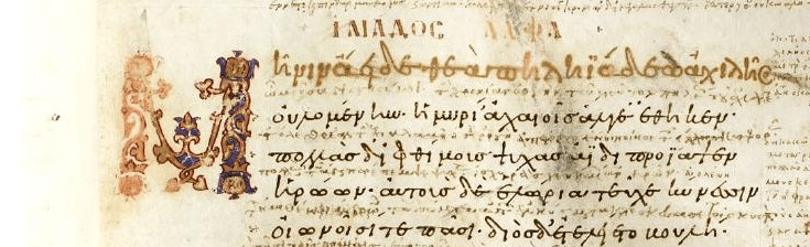 Note : l’image de haut de page montre les cinq premiers vers de l’Iliade dans le plus ancien manuscrit que l’on possède, le Venetus A. Il se trouve à Venise et date du Xe siècle. On voit à gauche le M historié de Μῆνιν qui désigne la colère d’Achille. La première ligne est écrite dans une encre de couleur (dorée ?) et le scribe semble avoir malencontreusement fait baver quelques lettres… La phrase qui est le sujet de cette page se trouve au dernier vers. Comme on l’a déjà vu, les minuscules de l’alphabet grec ont beaucoup évolué depuis 1000 ans.
